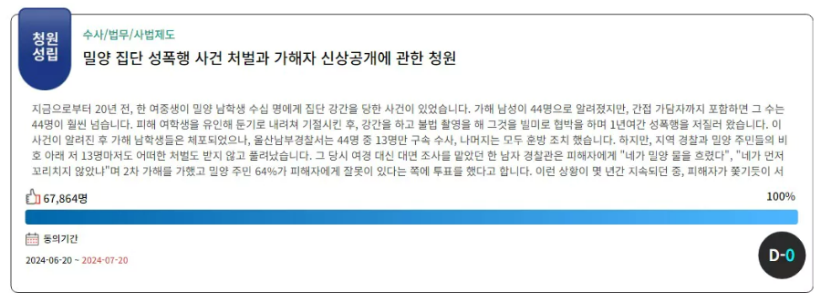 밀양 여중생 성폭행사건으로 알려진 이 사건은 최근 다시 수면위로 떠오르면서 가해자 신상공개 국민청원까지 등장했고, 청원 동의인원 5만 명을 넘어섰습니다.