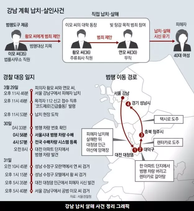 강남납치 살인사건은 지난 2023년 3월 29일, 서울 강남구에서 남성 2명이 여성 1명을 납치 후 살해한 뒤 시신을 유기한 사건으로 전 국민을 충격에 빠뜨렸던 사건입니다. 납치 현장이 고스란히 CCTV에 잡힌 것이죠. 그리고 불과 이틀 만에 피해자 시신이 발견되고 범인이 검거되었습니다.