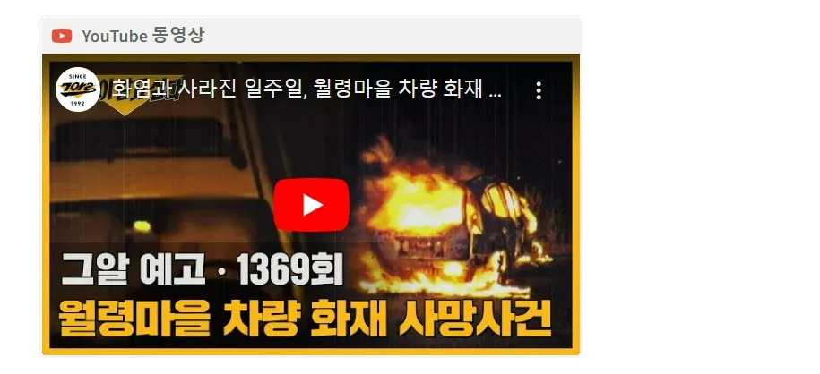 이번주 SBS <그것이 알고 싶다> 1369회에서는 '여름밤의 화염과 사라진 일주일 -월령마을 차량 화재 미스터리' 편을 방송합니다. 2009년 8월 군산의 월령마을에서 일어난 차량 화재 사망 사건을 재조명하는데요, 분신자살인지 방화살인인지 아직도 미스터리에 쌓여있는 사건이죠. 예고보기와 다시보기도 안내합니다.