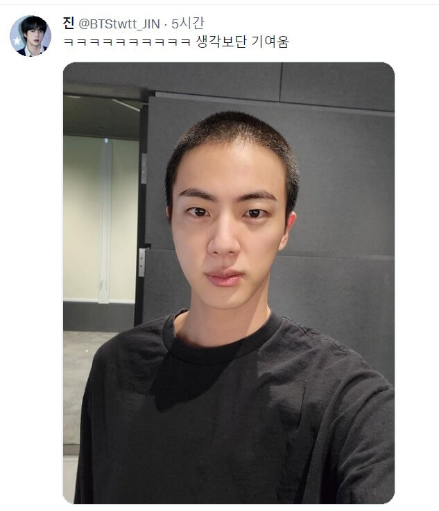 한편 진이 입대를 앞두고 삭발한 모습이 트윗에 올라왔습니다. 서른이라는 나이가 믿기지 않을 정도로 귀여운 미소년의 모습이네요.