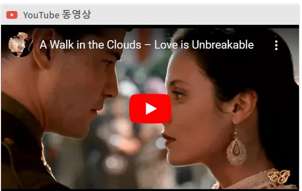 영화의 OST 역시 사랑하는 연인들이 감정을 전달하고 분위기를 끌어올리는데 한몫을 하고 있는데, 화려하고 로맨틱한 오케스트레이션으로 잘 알려져 있습니다. 특히, 타이틀 곡인 "A Walk in the Clouds"는 영화의 분위기를 잘 반영해주고 있죠. 영화음악을 듣는 것만으로도 연인들의 감정이 느껴집니다.