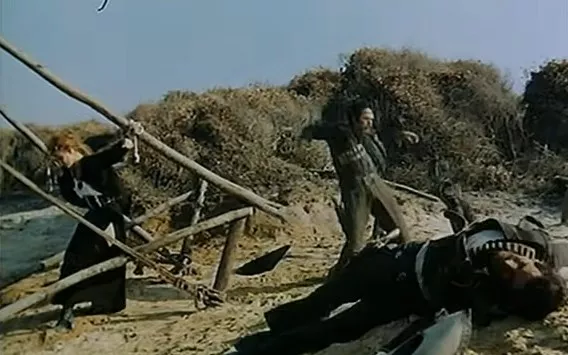 그리고 황금을 얻기 위해 우고 일당과 협력하는 듯하다가 그들을 배신하고 마리아와 함께 도망칩니다. 하지만 황금은 수렁에 빠져 사라지고, 장고 또한 우고 일당에게 붙잡혀 손이 으깨지고 맙니다. 총잡이로서의 역할을 수행할 수 없게 된 것이나 마찬가지죠. 이 상태에서 장고는 또다시 잭슨과의 결투를 벌이게 됩니다.