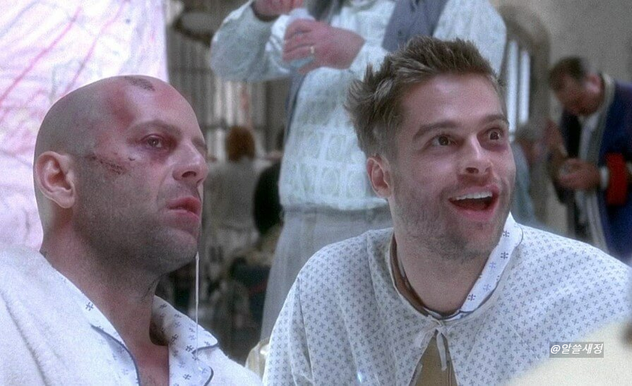 특히 정신병원에서 만난 제프리역을 맡은 브래드 피트의 리즈 시절을 볼 수 있는데, 그의 코믹 연기는 영화를 즐겁게 감상할 수 있는 포인트입니다.
